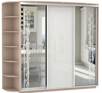 3-х дверный, корпус Дуб молочный, двери зеркало с аппликацией, стекло 1Е