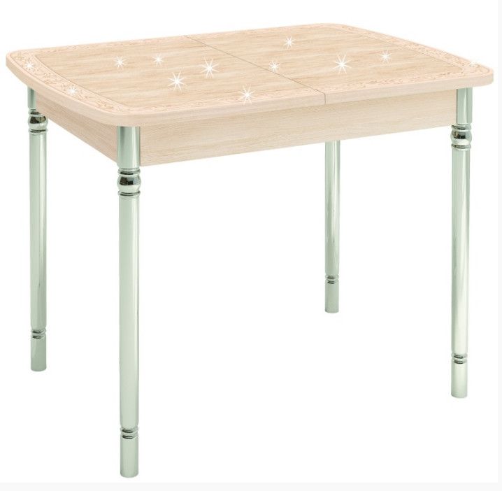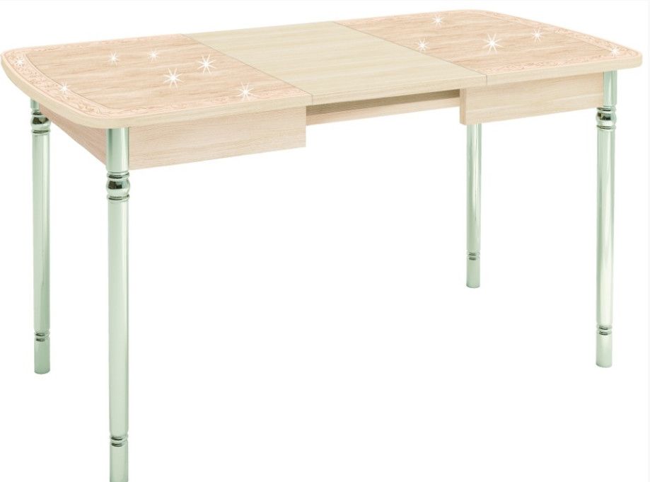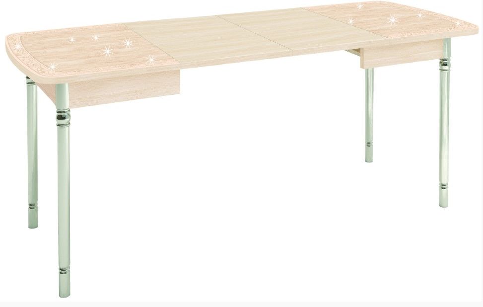 Блеск глиттерного рисунка под стеклом! Компактный стол, увеличивается в длину до 180 см! Скругленные края и хромированные металлические ножки.