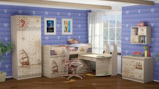 Коллекция детской мебели выполнена в стиле морских приключений. Минимальный состав модулей достаточен для обстановки детской комнаты. Направляющие шариковые полного выдвижения, петли с доводчиками. Комплекс универсальный позволяет экономить пространство комнаты за счет выдвижного рабочего места.