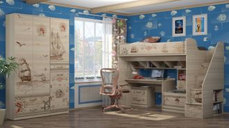 Коллекция детской мебели выполнена в стиле морских приключений. Минимальный состав модулей достаточен для обстановки детской комнаты. Направляющие шариковые полного выдвижения, петли с доводчиками. Комплекс универсальный позволяет экономить пространство комнаты за счет выдвижного рабочего места.