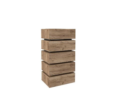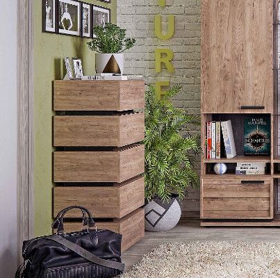 Для маленькой гостиной отлично подойдет высокий и узкий комод Nature 6. Гладкие фасады ящиков в теплом декоре Дуб Табачный Craft с контрастными черными боковыми планками снизу делают его по-настоящему особенным. Пять выдвижных ящиков глубиной 14 см способны вместить все необходимое, а компактная конструкция сэкономит место в комнате. Ящики легко открываются за свес благодаря направляющим полного выдвижения. Они быстро и легко устанавливаются при сборке комода. Регулируемые опоры компенсируют незначительные неровности пола.