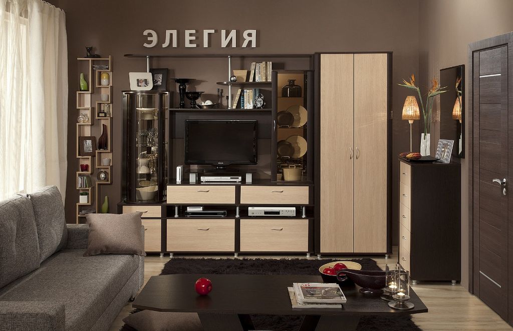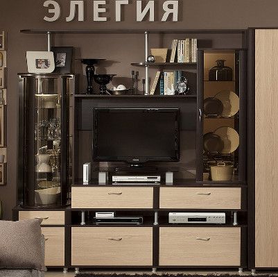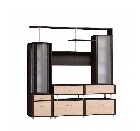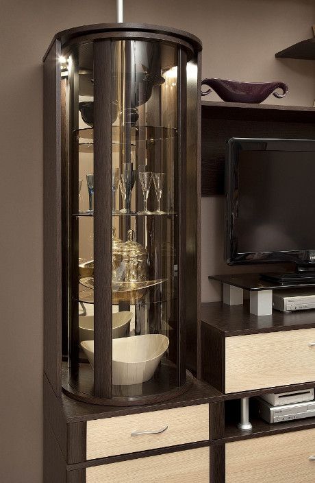 Шкаф МЦН 23 с прямыми фасадами, вместительными нишами для ТВ-аппаратуры и двумя витринами: вращающейся и прямой. Стекла витрин тонированные, а их задние стенки – зеркальные. Во избежание повреждений поверхности тумбы, при открывании стеклянных витрин, конструкцией предусмотрена деталь из ЛДСП под ними. МЦН 23 вмещает телевизор диагональю до 48''. Часто эксплуатируемые детали - с кромкой ПВХ 2 мм.