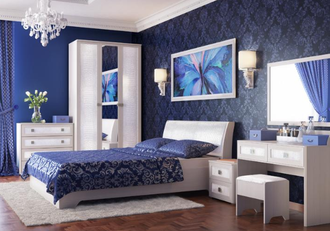 Мебельный гарнитур «Мона» – эстетичный комплект, способный украсить спальню и создать комфортные условия для отдыха. Набор включает вместительный шкаф с двумя отделениями и зеркалом по центру, двуспальную кровать с удобным изогнутым изголовьем, комод с четырьмя выдвижными ящиками, две прикроватные тумбы, туалетный столик и мягкий пуф. Светлая отделка, блестящая фурнитура, изящные формы обеспечивают мебели привлекательный внешний вид.
