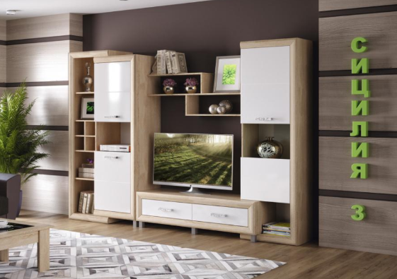 Красивая стенка «Сицилия-3», изготовленная с применением МДФ, ПВХ, ламинированной ДСП. Слева и справа имеются шкафы разного размера с отделами, закрывающимися глухими фасадами, и открытыми нишами. В центре – тумба под TV с двумя ящиками. Венчает модель композиция из полок, которую можно использовать для размещения сувениров, книг, декоративной посуды.