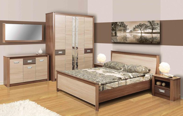 Мебельный гарнитур «Стелла» обладает эстетичным дизайном и позволяет комфортно организовать пространство в спальне. В комплект входят шкаф с двумя отделениями, двуспальная кровать, комод с тремя секциями и выдвижным ящиком, две прикроватные тумбы и навесное зеркало значительного размера. Гарнитур выполнен в тёплой бежево-коричневой гамме. Центральную часть шкафа украшают зеркальные полосы с декоративным рисунком. Тумбы оснащены выдвижными ящиками и полыми нишами в верхней части. Кровать имеет удобное наклонное изголовье.