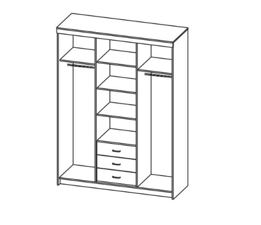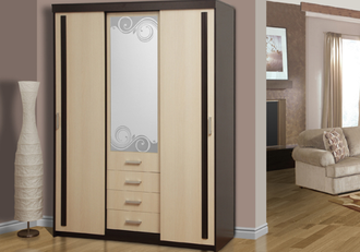 Элегантный, вместительный шкаф изготовлен из надёжных материалов. Справа и слева есть два больших отдела, оснащённых штангой для плечиков и полочкой для головных уборов. В центре в верхней части предусмотрен отсек с полками, который закрывается распашной створкой с красивым зеркалом. Оно украшено замысловатым пескоструйным рисунком, который придаёт изделию очень привлекательный вид. Под зеркалом – четыре выдвижных ящика, в которых можно хранить разные мелочи.