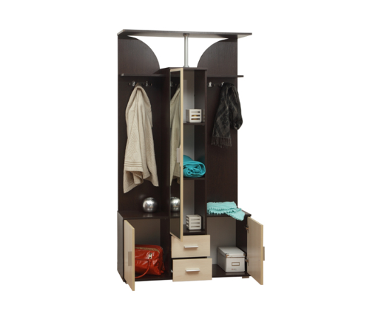 Качественная прихожая «Кармен-6» – практичное решение для прихожих небольшого размера. Слева и справа располагаются открытые вешалки с крючками, под которыми предусмотрены небольшие тумбы с распашными дверцами. В центре – шкаф-пенал с зеркальной дверцей, под которым располагаются два выдвижных ящика. В верхней части имеется полка для шапок, опирающаяся на металлическую хромированную трубу. Светлые фасады, оснащённые удобной фурнитурой, превосходно сочетаются с другими элементами тёмного цвета – такая контрастная гамма обеспечивает интерьеру особенный вид.