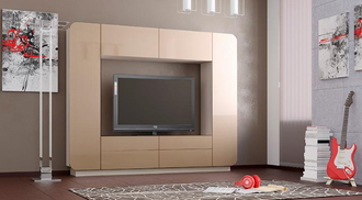 Внизу имеется четыре вместительных выдвижных ящика (комплектуются шариковыми направляющими) и два больших отделения вверху (комплектуются газлифтами) В каждой боковой секции по пять полок. Все дверцы, кроме верхних, оснащены толкателями. Цветовые решения в белом, черном или красном глянце придают стенке отличный внешний вид, подходящий для любого оттенка интерьера.