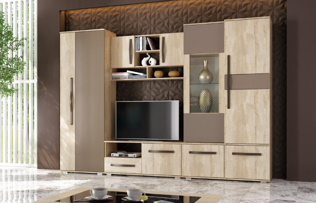 Красивая стенка из ламинированной ЛДСП в кофейном цвете «Мокко», а так же в белом глянце со множеством закрытых отсеков для хранения вещей. Слева секция для одежды с выдвижной штангой. В центре ниша для тв, вокруг которой расположены открытые стеллажи, а так же закрытые отделения.