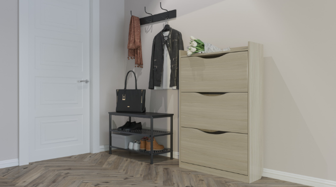 Обувной шкаф имеет ширину 800 мм, что увеличивает вместимость изделия. В одном отделении можно хранить от 4 до 6 пар взрослой обуви. Такой вариант лучше устанавливать в просторной прихожей, чтобы было больше свободного места. Особенность изделия заключается в отсутствии накладных ручек. Дверцы имеют вырезы в фасадах, которые служат ручками и отверстиями для вентиляции. В таком обувном шкафу ботинки, сапожки или туфли будут храниться в отличных условиях.