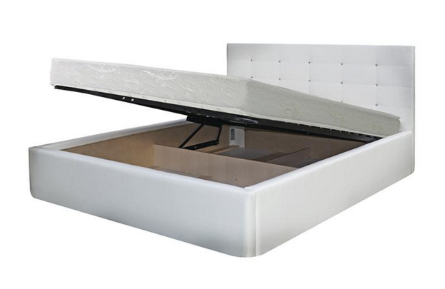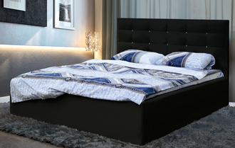 Кровать двуспальная «Виктория» обладает привлекательным внешним видом благодаря декорированию изголовья пуговицами с крупными кристаллами. Корпус и прямоугольная опорная спинка обтянуты кожзамом. Эффектная прострочка подчёркивает правильные геометрические формы изделия. Корпус кровати плотно прилегает к полу. Откидной механизм обеспечивает простоту подъёма металлического каркаса и доступ к секциям для хранения постельных принадлежностей.