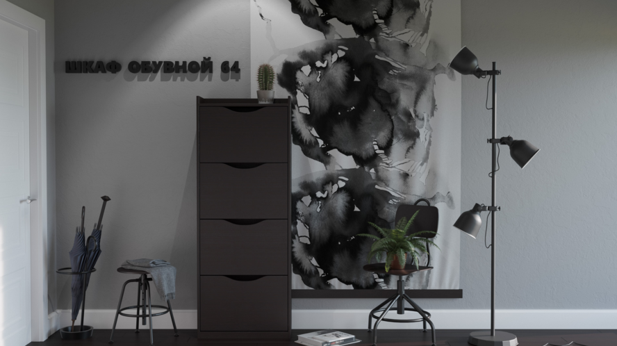 Обувной шкаф с четырьмя отделениями, безусловно, понадобится в большой семье. Каждый ящик оснащен полочкой, что позволяет хранить 4 и более пар взрослой обуви в одном отсеке. Отделения имеют дверцы с имитированными вырезанными ручками. Так же зазоры служат отверстиями для свободной циркуляции воздуха, поэтому обувь быстрее высыхает.
