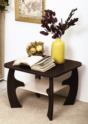 Очень компактный журнальный столик "Маджеста-5", способный дополнить интерьер практически любой гостиной. Его квадратная столешница со скруглёнными углами хорошо гармонирует с небольшой полочкой и плоскими фигурными ножками. Все детали изготавливаются из ДСП, их поверхность имитирует массив натурального дерева. Благодаря оригинальному сочетанию расцветок и красивой фактуре поверхности, столик смотрится современно и привлекательно.
