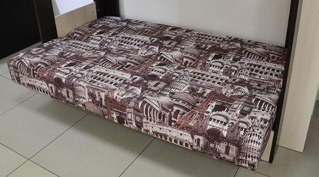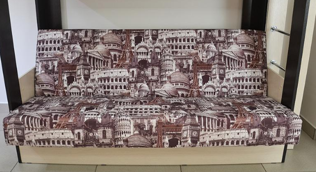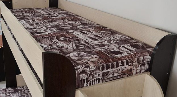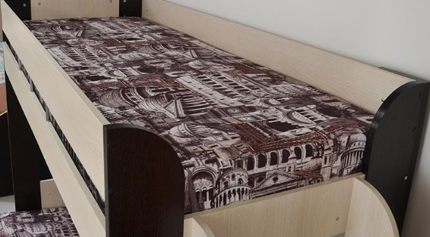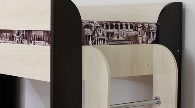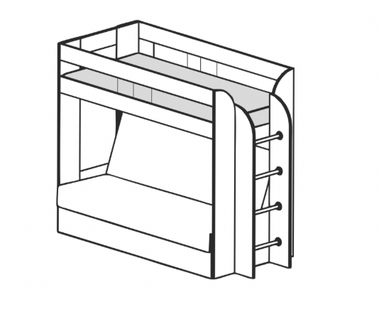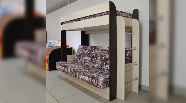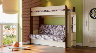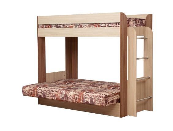 Если вам одновременно нужны двухъярусная кровать и диван-книжка для детской комнаты, то данное изделие - то что вам нужно. Нижний ярус такой конструкции – это классический раскладной диван со спальным местом, под которым находится вместительный ящик для постельных принадлежностей. Наверх ведёт расположенная в торце кровати вертикальная лесенка с четырьмя перекладинами. Верхнее спальное место меньше по ширине, чем нижнее и оборудовано предохраняющими от падения бортиками. Конструкция кровати позволяет сборку для лево- и правосторонней установки.