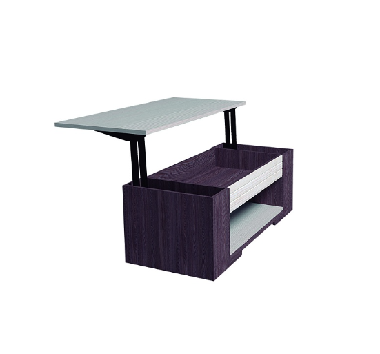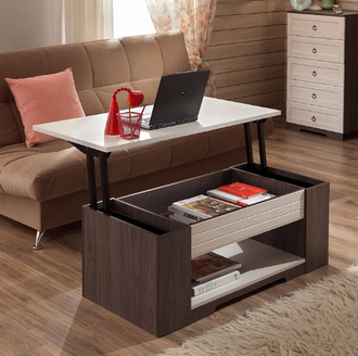 Удобный стол для гостиной: журнальный столик с широкой столешницей при необходимости превращается в рабочий стол. Высота столика в сборе составляет 457 мм, при поднятой столешнице - 720 мм. Улучшенный механизм трансформации с газовыми пружинами позволяет поднимать и опускать столешницу без особых усилий. Под столешницей - просторная ниша для документов и ноутбука с габаритами: ширина 831 мм, глубина 504 мм, высота 120 мм. На нижней полке удобно хранить книги, журналы, материалы для рукоделия.