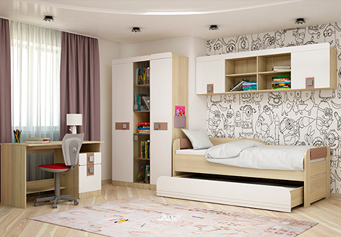Мебель для детей «Стиль» в цвете «Кофе с молоком» отличается мягкостью, теплотой, особым уютом, что очень актуально для интерьера. Важное свойство глянцевой поверхности - оно визуально расширяет пространство. Модульный ряд состоит из шкафов, кроватей для одного или двух детей, письменного стола со встроенной тумбой, вместительных стеллажей и навесных полок для хранения книг, журналов, детских поделок, фотографий, сувениров. Яркая, стильная, но при этом удобная и вместительная, такая мебель будет радовать Ваших детей долгие годы.