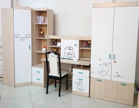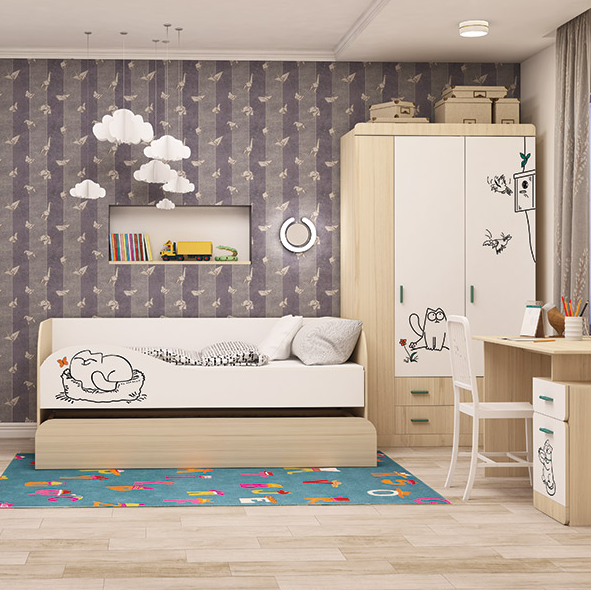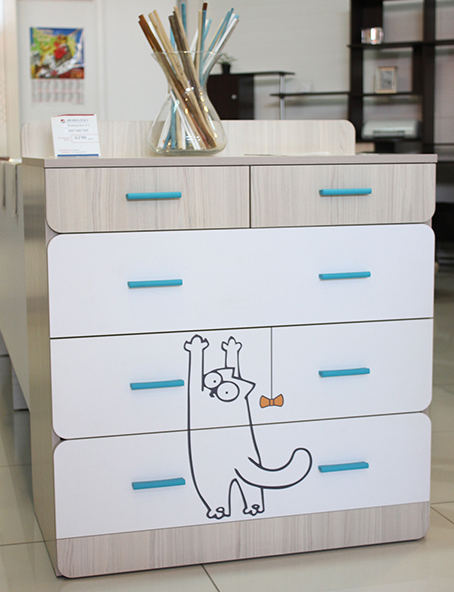 Детская «Кот» - удобная и безопасная мебель для вашего ребенка. Яркий принт на мебели создаст атмосферу в детской комнате. Каждый модуль комплектуется ручками двух цветов, что даст Вам прекрасную возможность, выбрать более подходящий цвет для вашего интерьера.