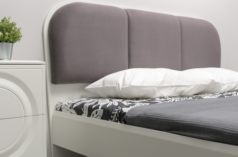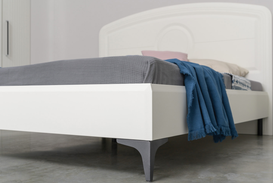 Кровать установлена на высокие ножки, что делает конструкцию лёгкой и воздушной, изголовье кровати декорировано пышным мягким элементом. Матрас укладывается на ортопедическое основание с гнутоклееными ламелями.