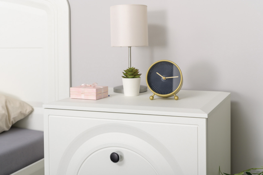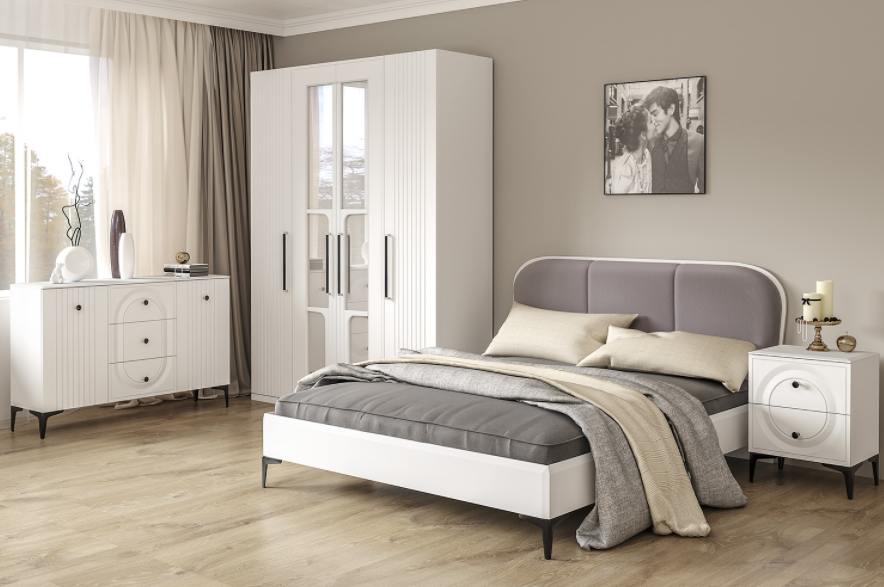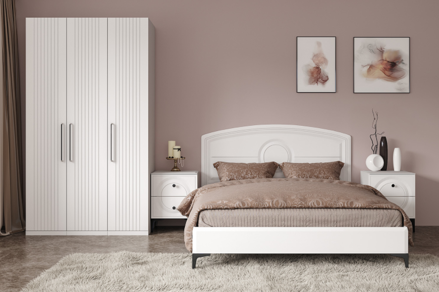 Основным декоративным элементом коллекции является круг. Явно представленный фрезеровкой по фасадам тумбы, комода, в изголовье кровати и ручках-кнопках.