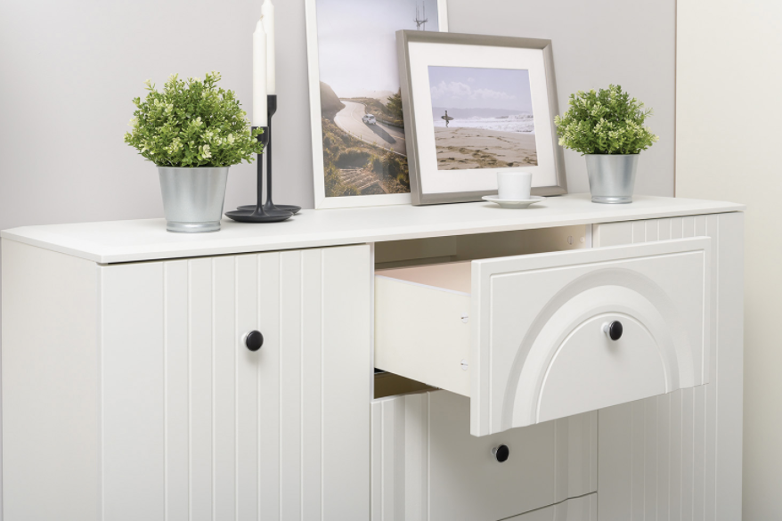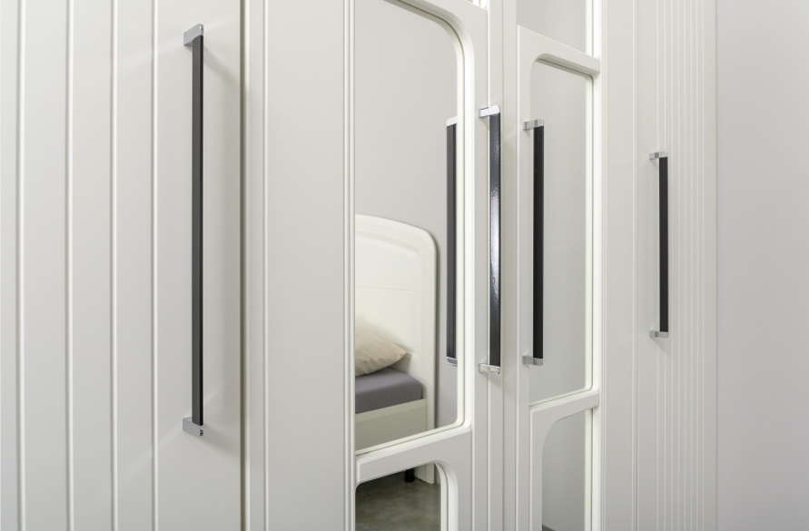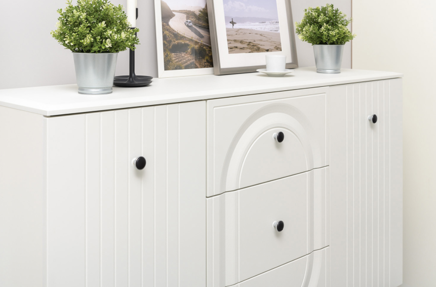 Вся лицевая фурнитура металлическая, графичное и стильное сочетание черного и хромированных деталей эффектно расставляет акценты на мебели.