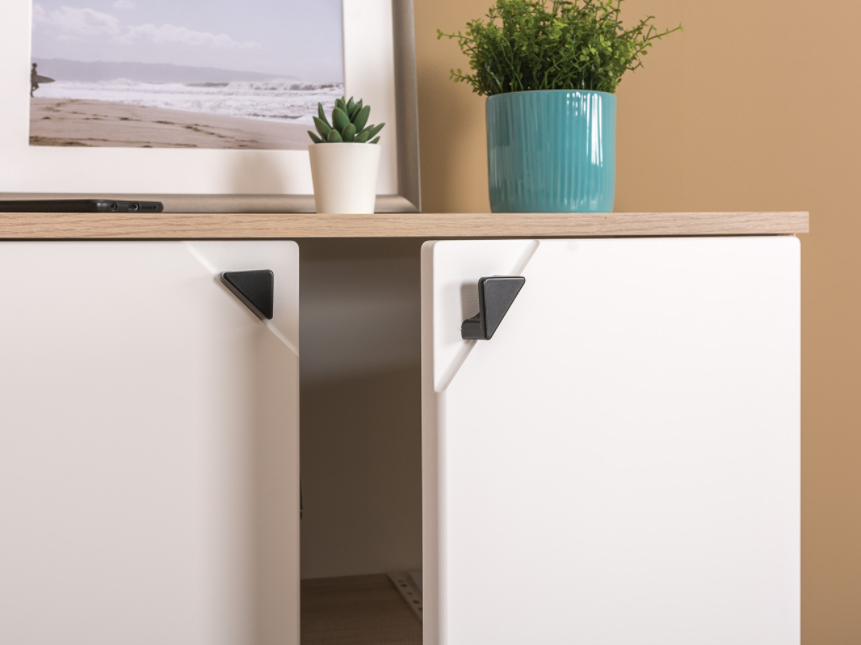Минималистичная лицевая фурнитура выполнена в виде чёрных уголков-треугольников, которые чётко видны на белых фасадах и устанавливаются в специально выполненное углубление.
